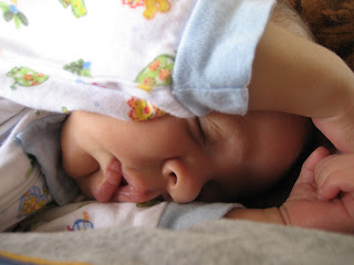 As of Tuesday he weighs 9 pounds, 1 ounce and is 22 3/4 inches long. I just can't believe how fast he is growing. Apparently, breast milk does a body good! He is getting chubby little cheeks and a round little belly too - way too cute! I don't know how I lived before he was here.